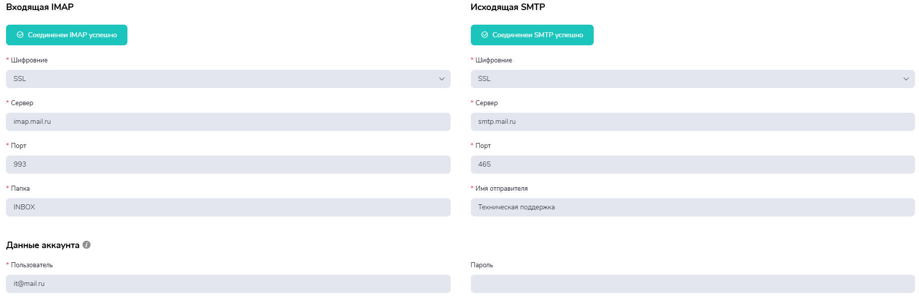 Пример настройки службеного почтового ящика на примере mail.ru: