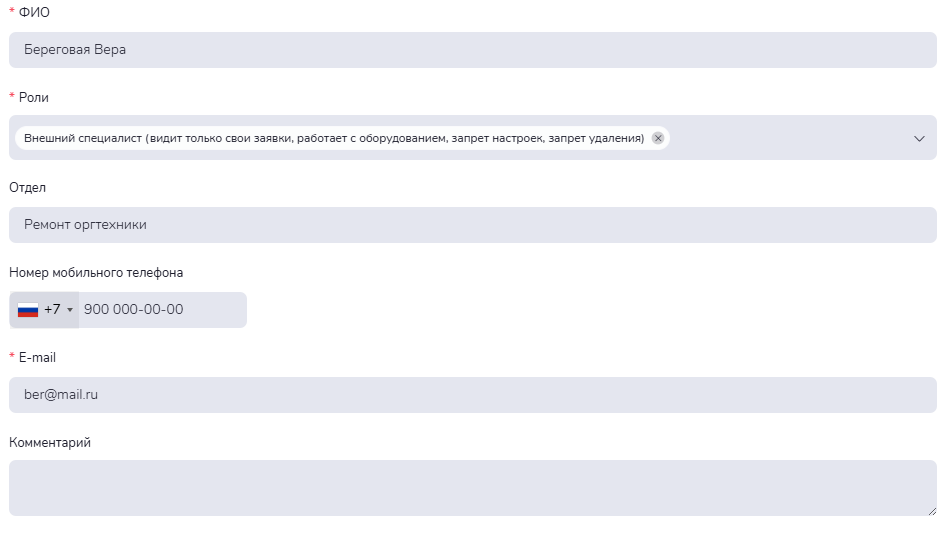 При добавлении сотрудника указывается ФИО, роль, номер мобильного телефона, электронная почта