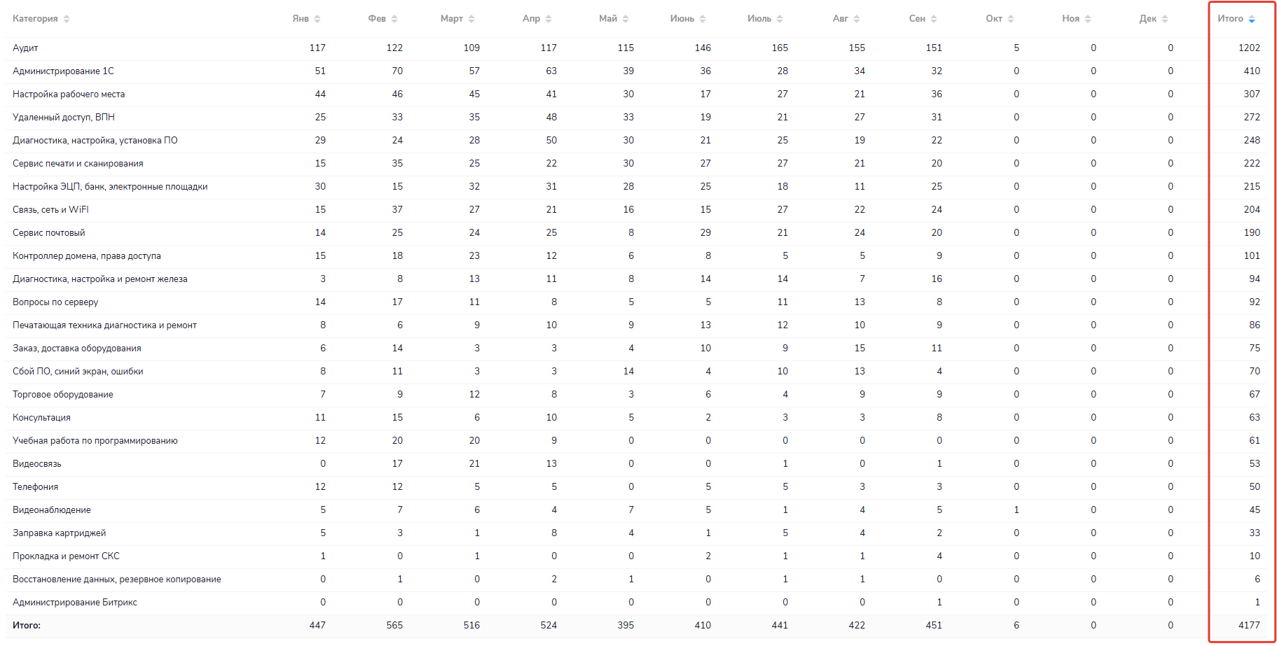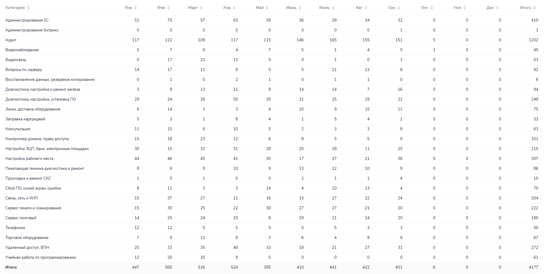 Отчет по категориям отображает объем заявок сгруппированных по месяцам за год.