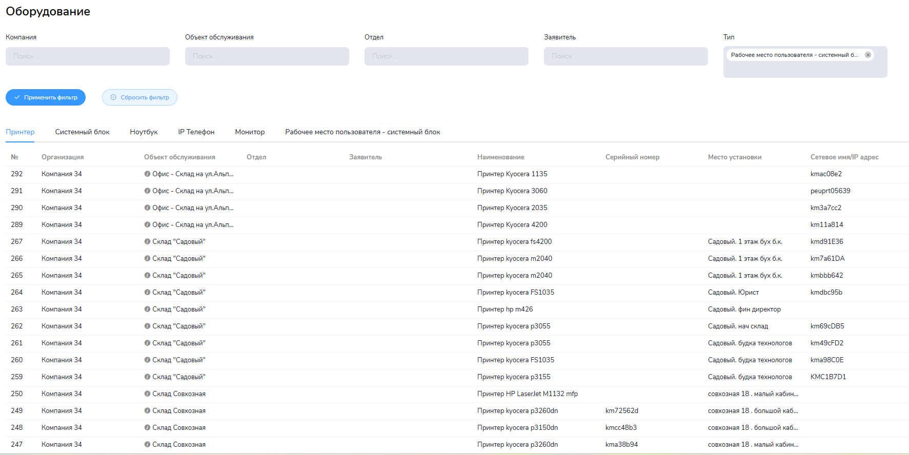 Отчет по оборудованию позволяет сформировать список оборудования по всем компаниям или по указанным в фильтре отчета