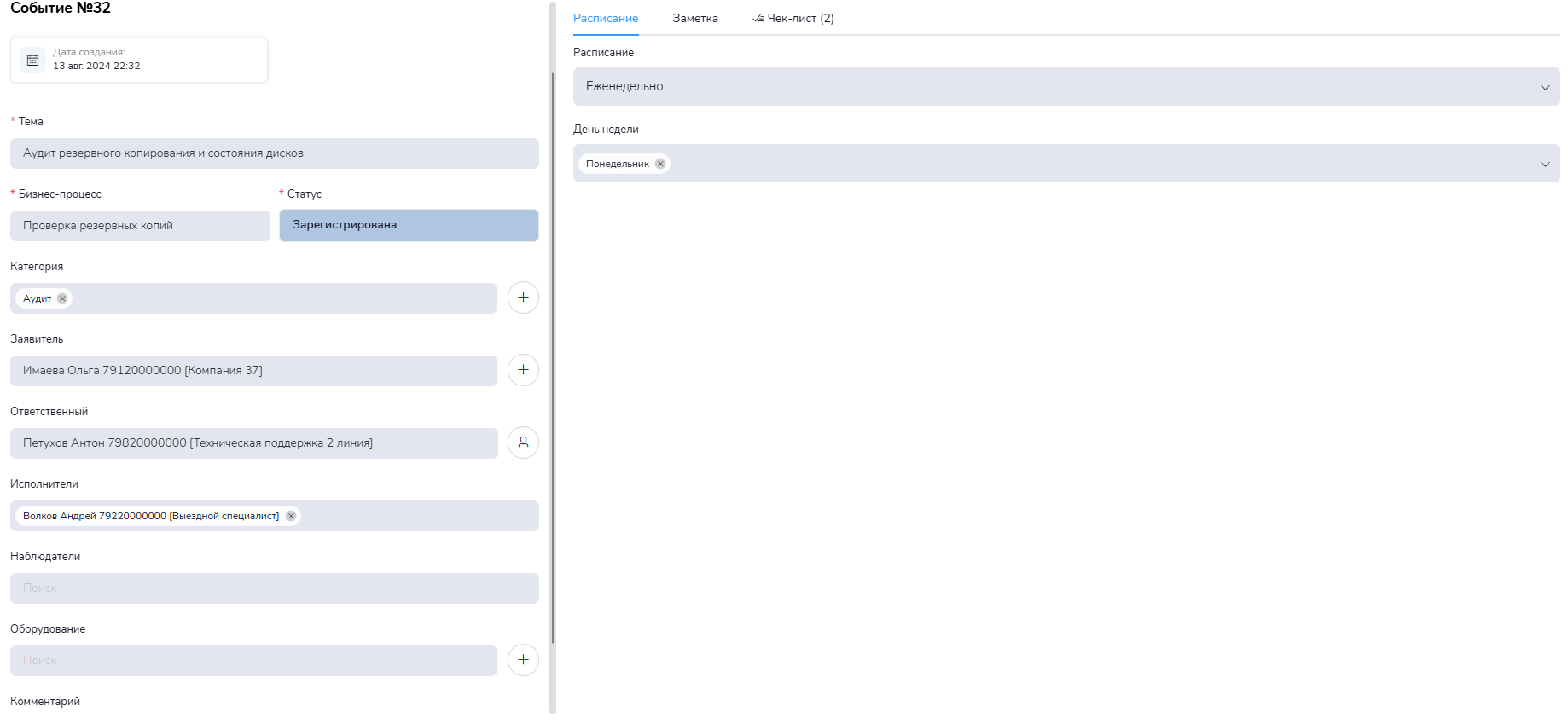 Созданные события будут автоматически создавать заявки, назначать исполнителей, уведомлять всех участников заявки. Ответственные специалисты будут получать уведомления о ходе работы.