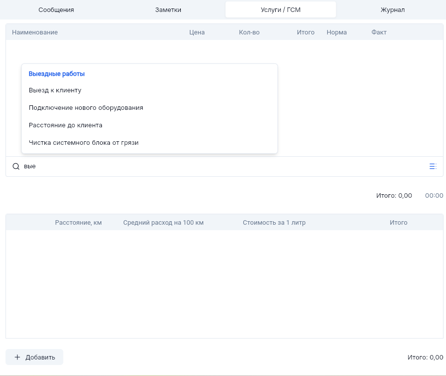 Область данных заявки, Услуги. Списание трудозатрат и гсм по заявке.