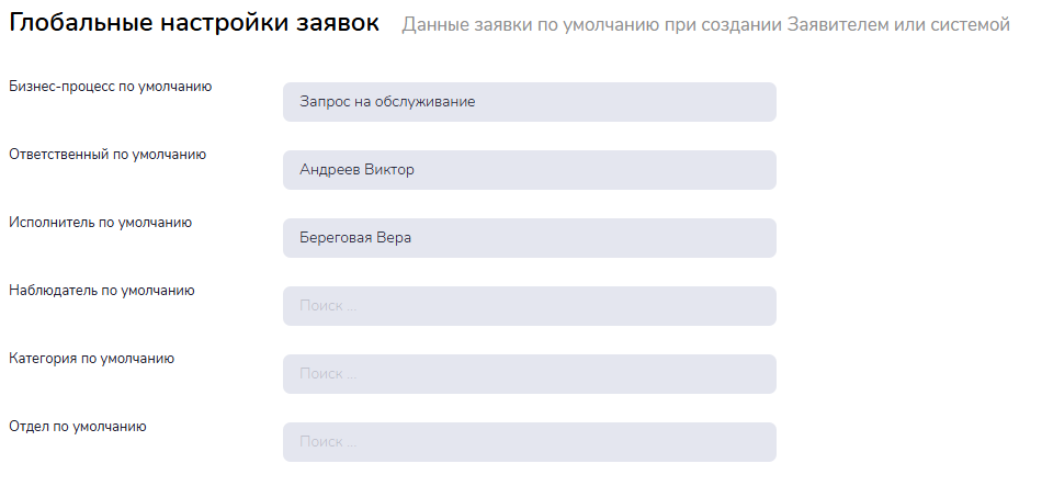 Параметры заявки по умолчанию