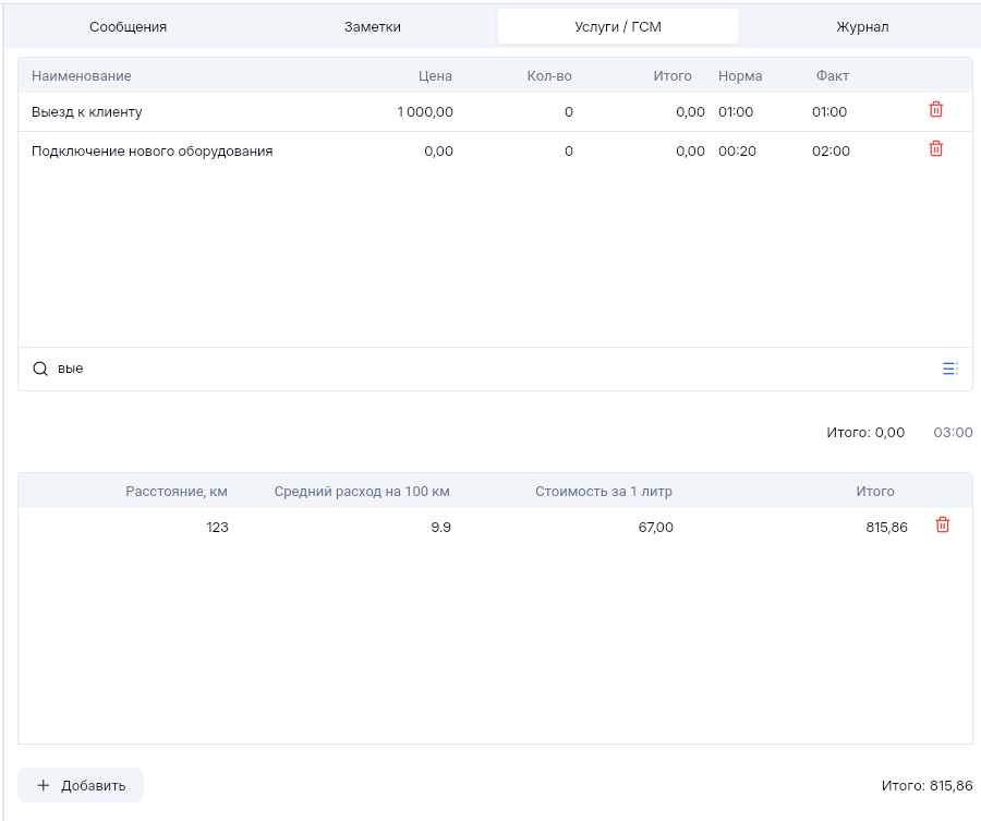 Область данных заявки, Услуги. Списание трудозатрат и гсм по заявке.