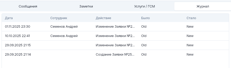 Область данных заявки, Услуги. Журнал действий по заявке.